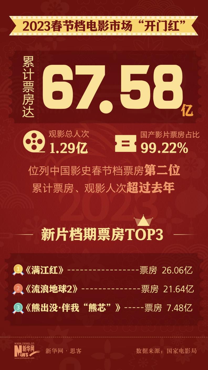据国家电影局初步统计,2023年春节档(1月21日至27日)电影票房为67.58亿元,仅次于2021年春节档的78.42亿元,位居中国影史同期票房第二名。影院的春天回来了,电影行业的希望也回归了。