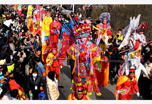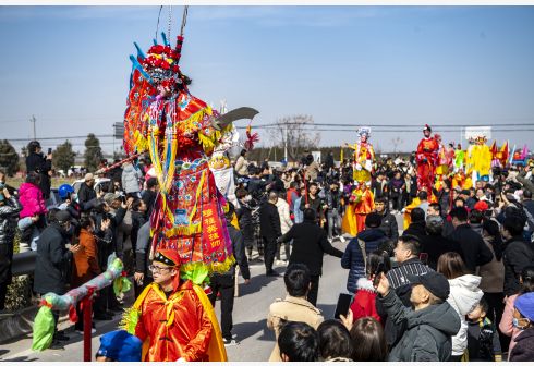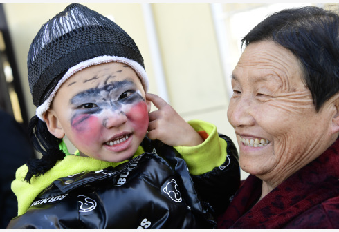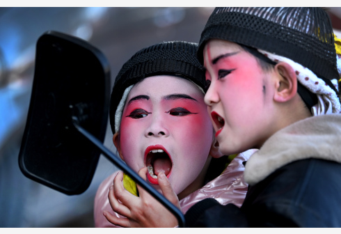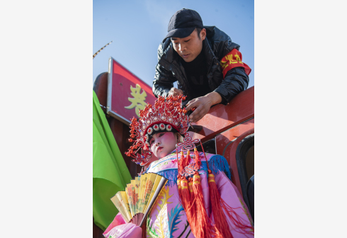 2月19日,西安市临潼区栎阳街道卷子村村民为即将上阵表演“背芯子”的小朋友整理装束造型。当日是农历正月二十九,陕西省西安市临潼区栎阳街道卷子村举行“背芯子”表演,吸引了许多群众前来观看。“背芯子”是中国民间社火表演的一种,背杆用特制的铁架子绑在背者身上,上端站有四五岁的儿童,按照故事内容扮成不同的人物。背者加上上端儿童高达三米多,随着鼓点踏着碎步进行表演。2011年10月,栎阳镇卷子村“背芯子”被列入西安市第三批非物质文化遗产代表性项目名录。 新华社发(袁景智 摄)