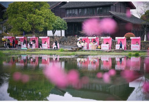 3月25日,游客在杭州皋亭山景区千桃园内的春日沿湖市集游玩购物。当日,第十届皋亭观桃节正式启动,游客在杭州皋亭山景区千桃园游玩、逛市集,感受春色。近年来,当地大力改善村容村貌,连续多年开展春日赏花游园活动,助力乡村文旅融合。 新华社记者 江汉 摄