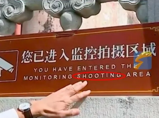 俞敏洪指出,“您已进入监控拍摄区域”的英文翻译中多了“shooting”一词。