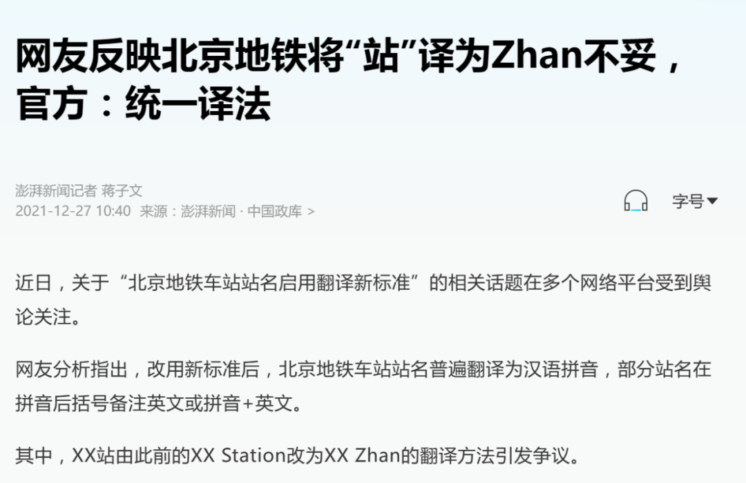 由于翻译标准各不相同,从而产生不同的翻译版本,这是国内地名服务等标识翻译混乱的第一个原因。之前闹得沸沸扬扬的地铁站“station”改“zhan”风波,其实就是翻译标准更新导致的。