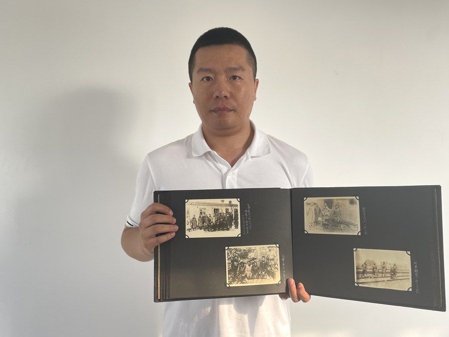 侵华日军第七三一部队罪证陈列馆研究人员金士成展示日军侵华战时照片。新华社发(侵华日军第七三一部队罪证陈列馆供图)