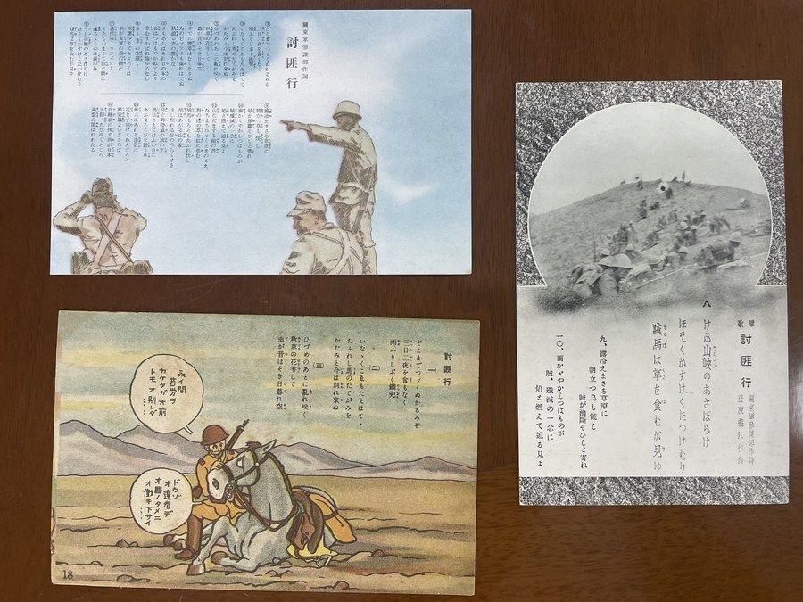 此次赴日征集到38份印有歌曲《讨匪行》的明信片,均为普通侵华日军官兵日常邮寄所用,其背景内容包括战斗场面写真、个人战场体验、日本国内情形及对中国军民、风土人情的观察,多以照片或漫画形式呈现。《讨匪行》是1932年由关东军参谋部作词、藤原义江作曲,在侵华日军内传唱的一首军国主义歌曲,“匪”指的是以东北抗日联军为主体的抗日武装力量。