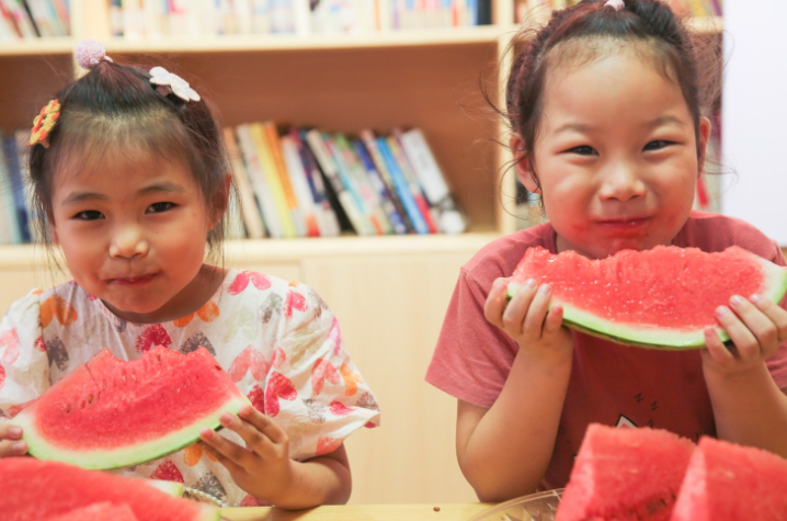 在如皋市如城街道城东社区东皋书吧,小朋友在比赛吃西瓜,趣味消暑。 徐慧 摄 视觉江苏网供图