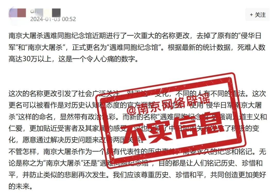 近日,网络上有消息传言“侵华日军南京大屠杀遇难同胞纪念馆更名为遇难同胞纪念馆”,引发一些网民朋友的关注和讨论。