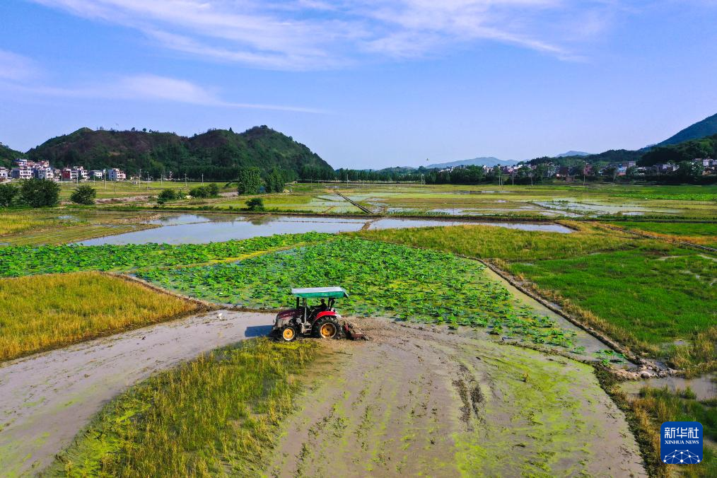 5月14日,湖南省郴州市桂阳县流峰镇农民驾驶农机在翻耕农田(无人机照片)。新华社发(周秀鱼春摄)