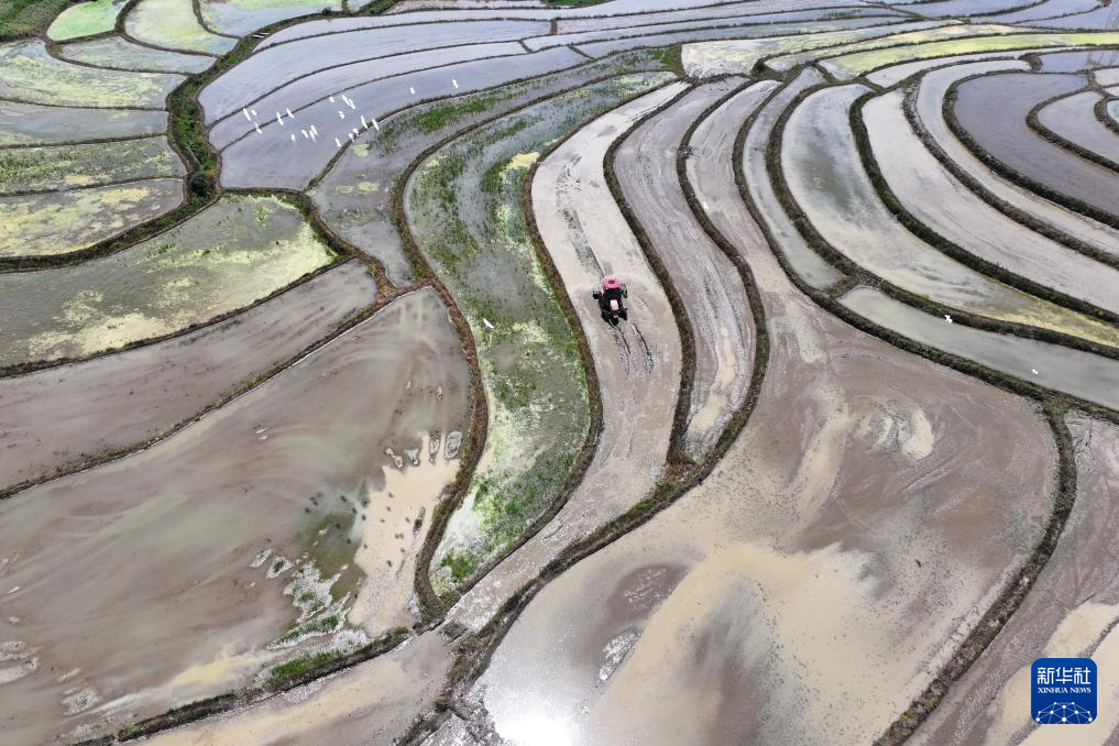5月14日,在贵州省黔东南苗族侗族自治州岑巩县水尾镇新场村,农机手驾驶农机犁田(无人机照片)。新华社发(杨云摄)