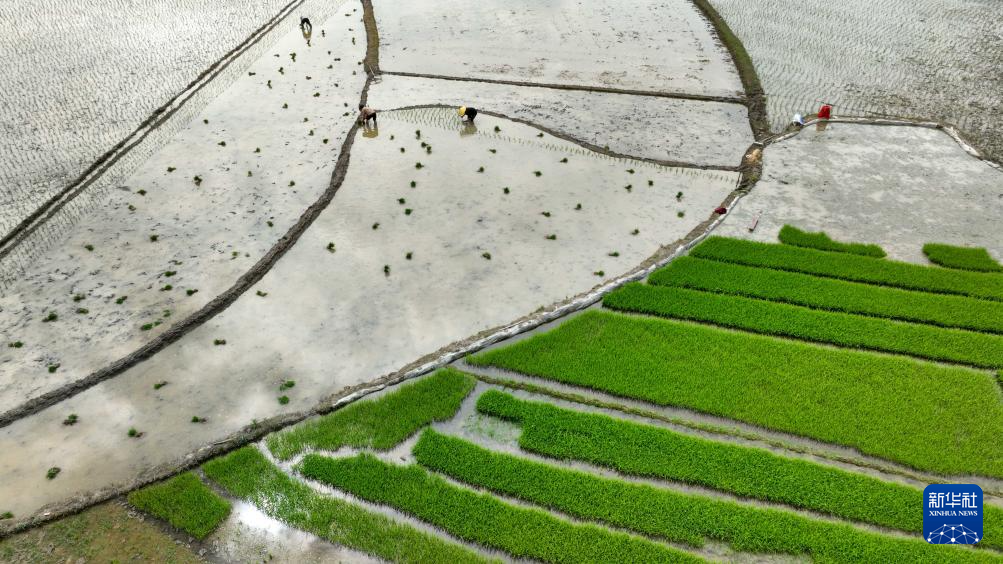 5月14日,村民在贵州省开阳县马头村移栽秧苗(无人机照片)。新华社发(袁福洪摄)