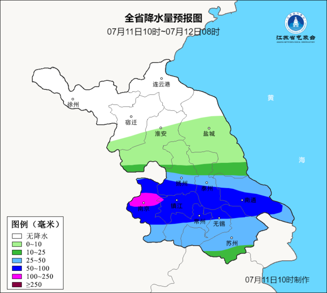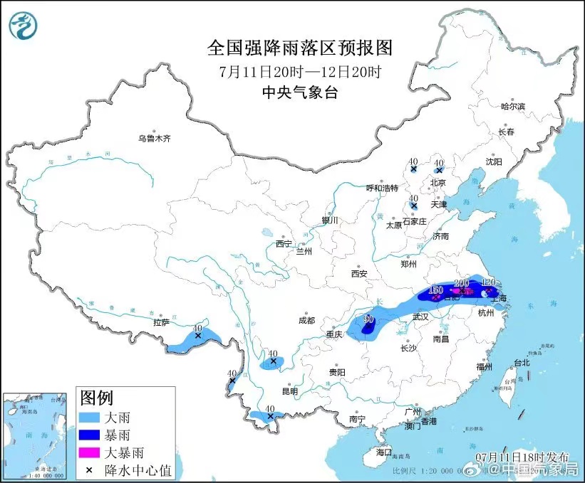 根据中央气象台预报,7月11日20时至12日20时,安徽中部、江苏南部、上海、浙江北部等地的部分地区有大到暴雨,其中,安徽中部、江苏南部等地局地有大暴雨(100~200毫米)。