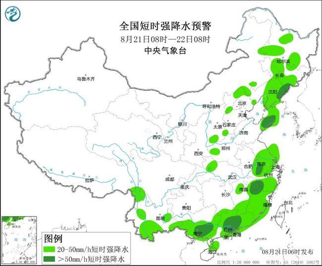 预计8月21日8时至22日8时,内蒙古东部、东北地区中部和南部、华北东北部和南部、黄淮西部和东北部、江汉西部、江南东部、华南中东部等地的部分地区将有8级以上雷暴大风或冰雹天气,其中,山西南部、河南北部和西部等地的部分地区将有10级以上雷暴大风,最大风力可达11级以上;东北地区、华北、黄淮西部和东北部、江汉西部、江南中部和东部、华南、西南地区南部等地的部分地区将有小时雨量大于20毫米的短时强降水天气,其中,吉林东南部、辽宁东部、山东东部、安徽东南部、江西东北部、浙江西南部、福建西北部、广西南部、广东中部等地的部分地区小时雨量大于50毫米,最大可达80毫米以上。