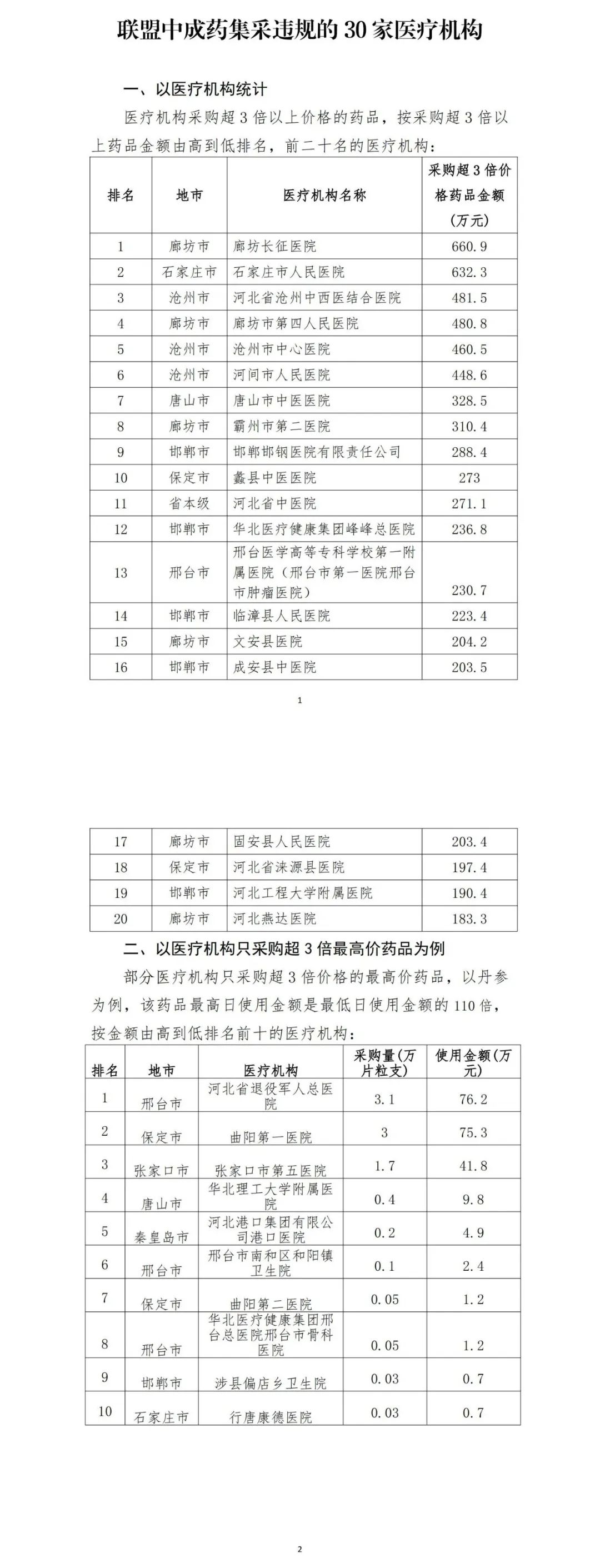 近日,河北省医保局向下级单位和医疗机构下发了文件,对各市及医疗机构采购中成药情况进行了通报,30家医院被点名。《通报》指出,医疗机构采购使用湖北中成药联盟集采药品存在采购使用高价药品的情况,采购超3倍以上的高价或次高价药品的医疗机构达2447家,超3倍药品采购金额2.27亿元,占总采购金额的69.83%。以丹参为例,换算成每天的使用金额,医疗机构采购最高价是最低价的110倍。《通报》分统筹区和医疗机构两个维度,按照高价药采购总金额从高到低排名,对各统筹区采购情况进行了排名通报,30家采购金额靠前的医院被点名。