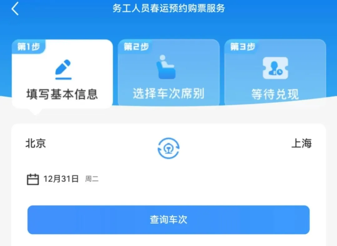 2024年12月15日至2025年2月7日,已通过实名制核验的务工人员可在铁路12306手机客户端“务工人员春运预约购票服务”专区,预约购买2024年12月31日至2025年2月23日的火车票。