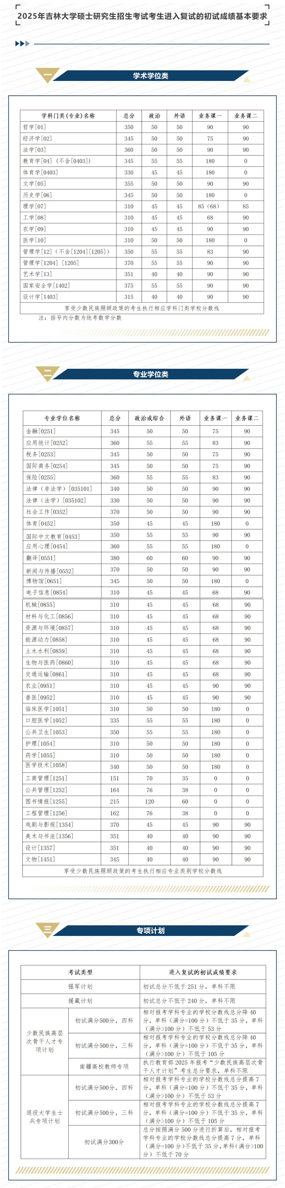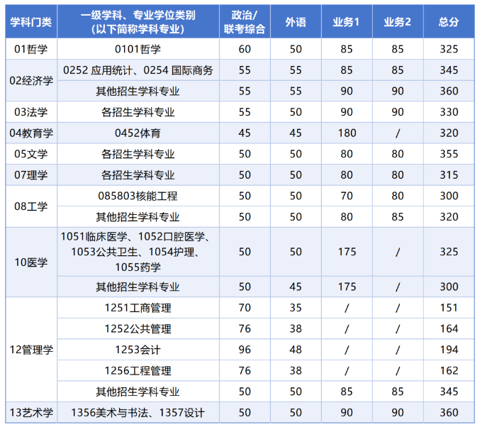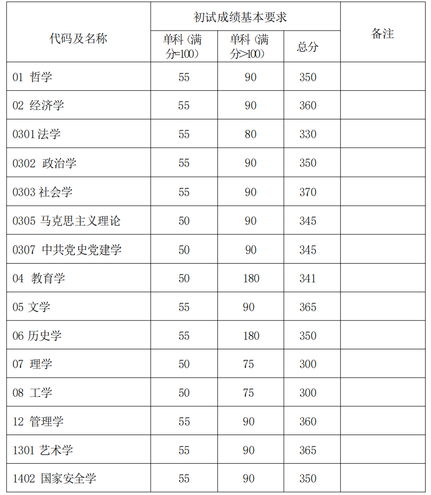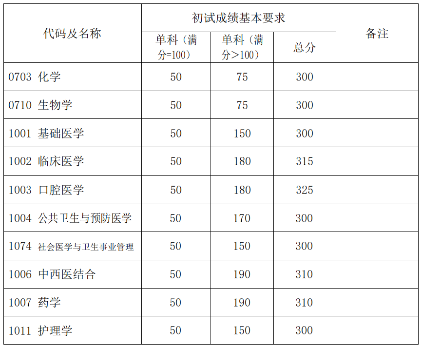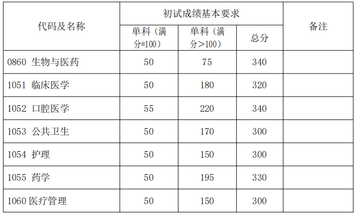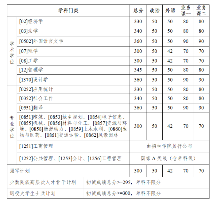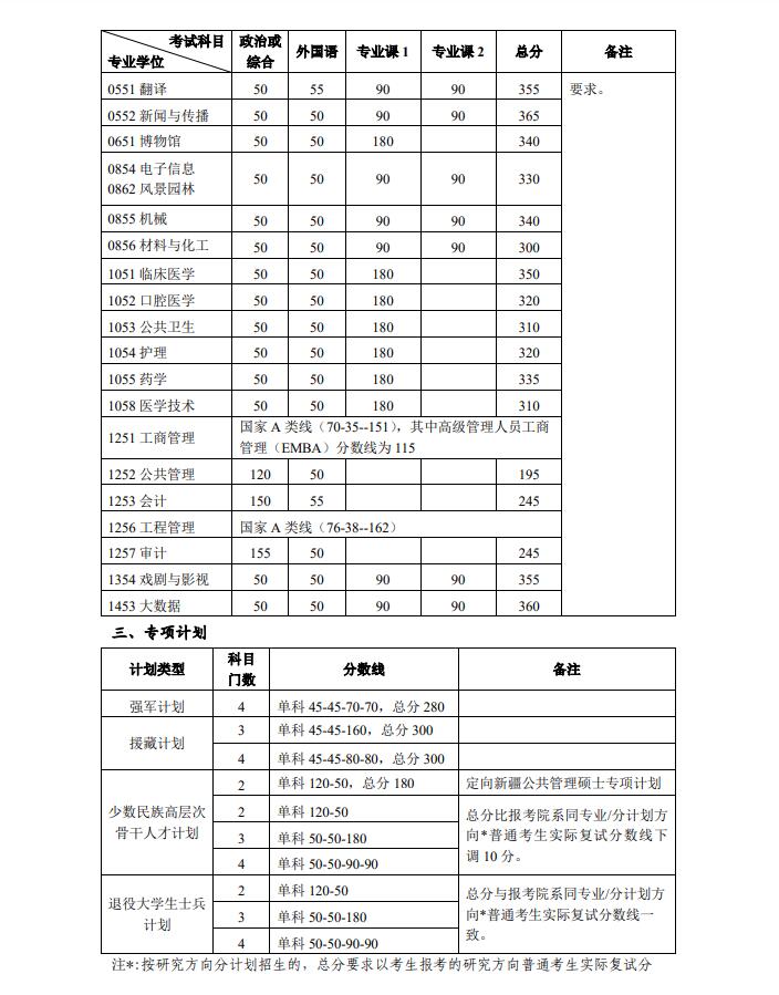 其中面向西藏地区“公共管理人才培养计划”专项,满分100分的单科成绩不低于40分、满分200分的单科成绩不低于90分、总分不低于160分;面向新疆喀什地区医学硕士专项,总分不低于235分,各单科成绩不作要求。