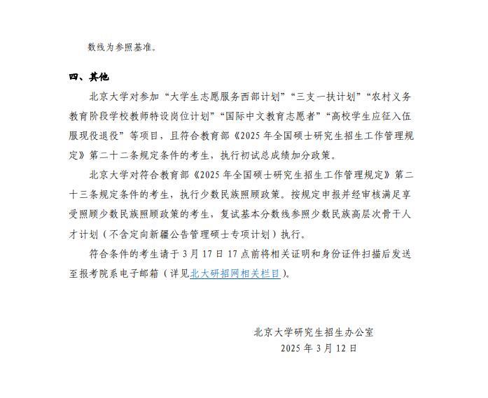 符合教育部规定并在网上报名时申请享受初试加分政策的考生可于3月14日前登录我校采集系统(https://yz2025.bnu.edu.cn/www/ss/csjf/login)提交相关证明材料,未按规定提交材料的,不享受相应加分政策。我校根据教育部最新文件及名单审核考生资格,符合资格的考生将享受初试成绩总分加分(单科不加分)。