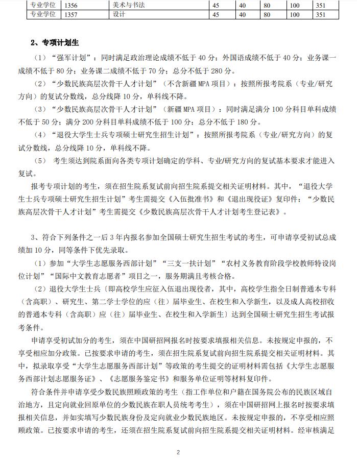 3.参加“大学生志愿服务西部计划”“三支一扶计划”“农村义务教育阶段学校教师特设岗位计划”“国际中文教育志愿者”“高校学生应征入伍服义务兵役退役”等项目服务期满并考核合格的考生,按照教育部当年度相关规定享受加分政策。以上加分项目不累计。工作单位和户籍在国务院公布的民族区域自治地方,且定向就业单位为原单位的少数民族在职人员考生,在学校划定的复试基本分数线基础上总分降10分。照顾政策按照有关部门审核结果执行。报考专项计划的考生,不再享受初试加分和少数民族照顾政策。