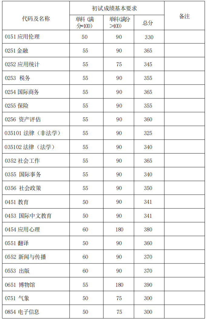 专业学位初试成绩基本要求
