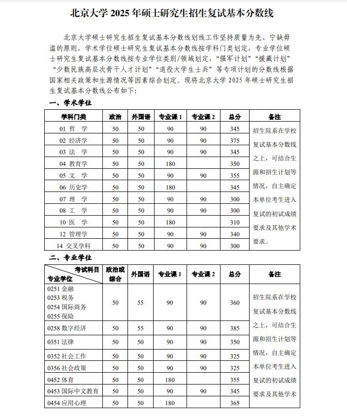北京师范大学2025年硕士研究生招生学校复试基本分数线