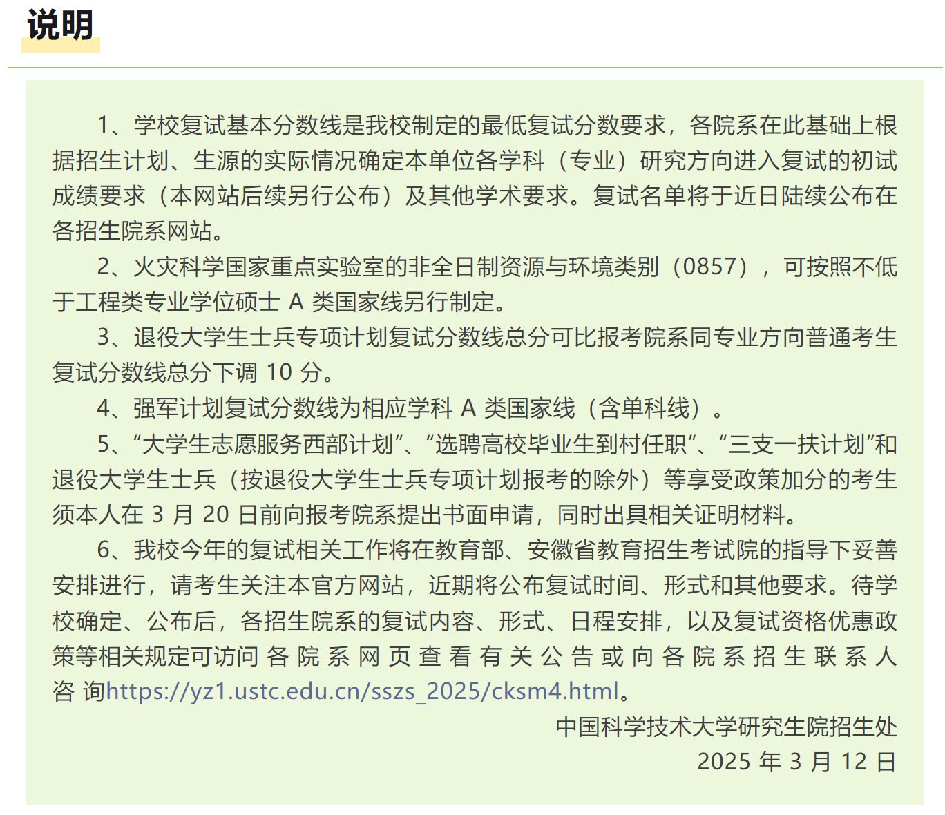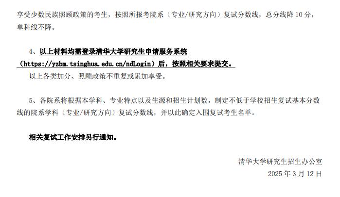 3.我校2025年原则上采取现场复试方式,各招生院系的复试通知及复试工作实施细则将于近期陆续发布,请关注我校研招网及院系网站通知,提前做好复试准备。