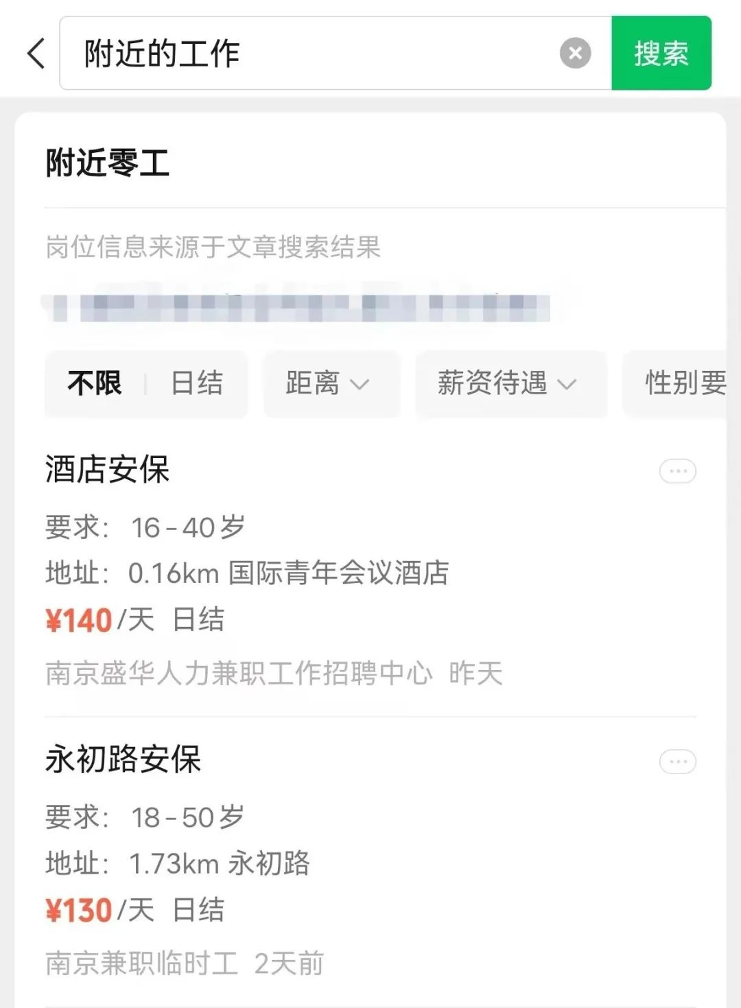 微信内搜索“附近的工作”“兼职”“日结”“零工”等关键词,就能自动匹配所在城市的零工岗位,还能根据“距离”“薪资待遇”“性别”等快速筛选。目前已覆盖北京、上海、南京等全国超200个地市。