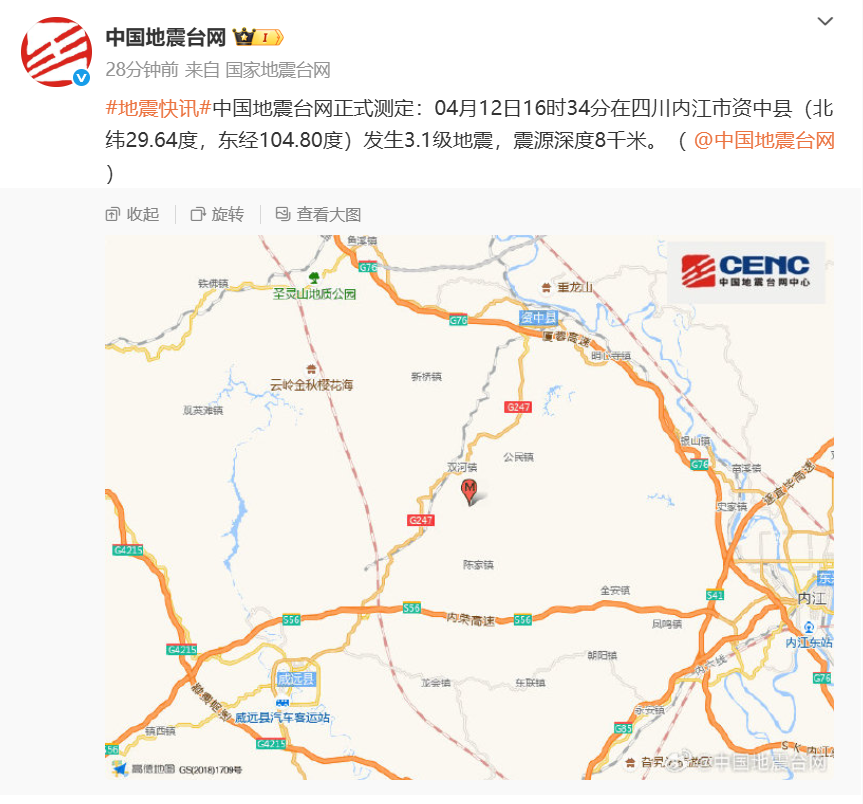 中国地震台网正式测定:04月12日16时34分在四川内江市资中县(北纬29.64度,东经104.80度)发生3.1级地震,震源深度8千米。