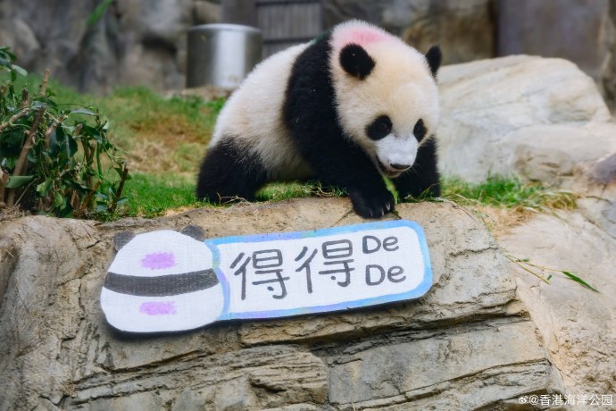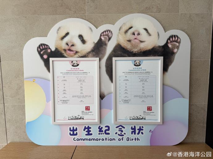 香港海洋公园27日举办发布会,公布首对“港产”龙凤胎大熊猫正式命名为“加加”“得得”。