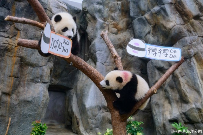 目前“加加”“得得”体能正在稳健发展,越来越喜爱探索四周、挑战自己。香港海洋公园扩大“加加”“得得”与妈妈“盈盈”的生活空间,开放邻近“大熊猫之旅”展馆入口处的高地区域供它们生活。同日起,它们在“大熊猫之旅”中间区域一起与访客见面。市民和旅客可直接在展馆外排队,无需预先领取入场券。