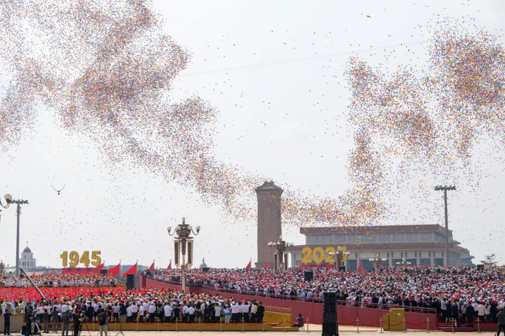 9月3日上午,阅兵活动结束后,《歌唱祖国》响彻天安门广场,全场热血沸腾。鸽笼开启,8万羽和平鸽展翅高飞,礼赞和平;8万只气球腾空而起,色彩缤纷。