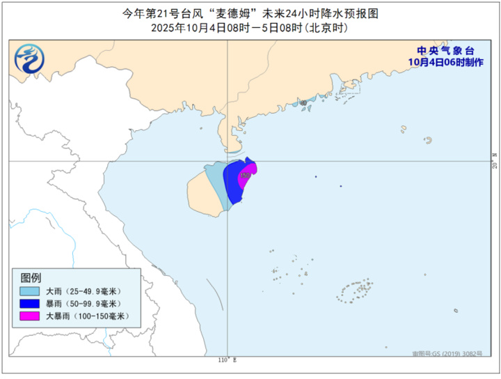 大风预报:4日08时至5日08时,巴士海峡、南海北部和中部海域、东沙群岛、西沙群岛、中沙群岛及黄岩岛附近海域、北部湾中东部、琼州海峡、广西沿海、广东西南部及沿海、海南岛及沿海、台湾岛南部沿海有5-7级、阵风8-10级的大风,其中,南海西北部海域、琼州海峡、广东西部沿海、海南岛东部和北部沿海的风力有8-11级,阵风12-13级,“麦德姆”中心经过的附近海域或地区风力可达12-14级,阵风15-16级。