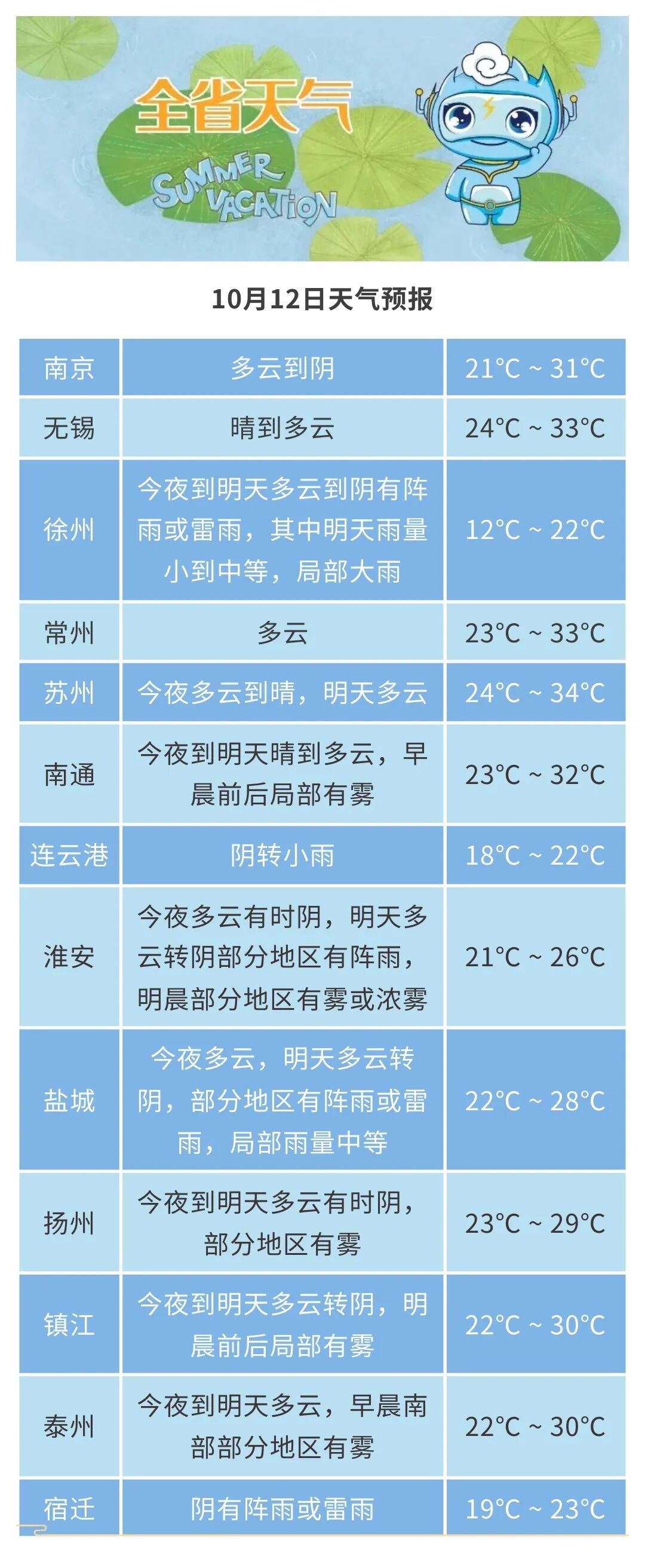 此外,明后两天,江苏南北的温差较大。明天,苏锡常、南通等地的最高气温还能达到30℃以上。而徐州,明后两天的最高气温都只有十几度。