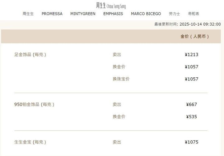 受国际金价影响,中国国内珠宝品牌足金首饰价格也出现上涨。14日,从已更新的情况来看,周生生足金饰品价格已涨至1213元/克。