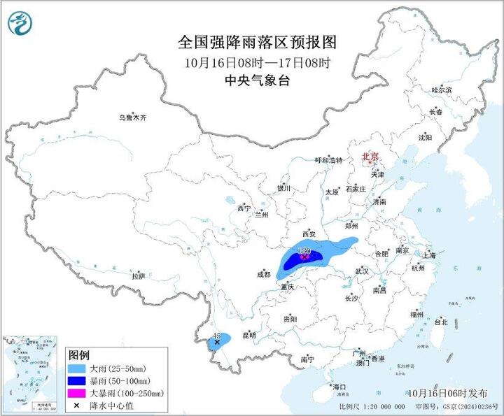 中央气象台10月16日06时发布暴雨蓝色预警:预计,10月16日08时至17日08时,陕西南部、河南南部、湖北西部、四川盆地东北部、重庆东北部、云南西南部等地部分地区有大到暴雨,其中,陕西东南部、湖北西北部、四川盆地东北部、重庆东北部等地部分地区有大暴雨(100~120毫米)。上述部分地区伴有短时强降水(最大小时降雨量20~40毫米,局地可超过50毫米)。