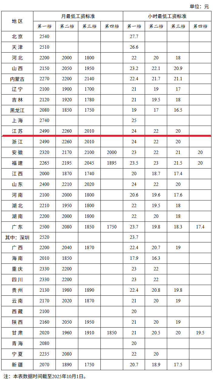其中,江苏第一档月最低工资标准为2490元,第一档小时最低工资标准为24元。