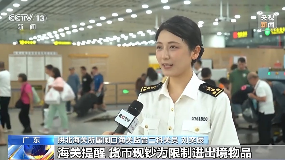 拱北海关所属闸口海关监管二科关员刘奕辰:海关提醒,货币现钞属于限制进出境物品。根据相关规定,携带外币现钞15天内首次出境时,限额为等值5000美元。如确需携带超出限额的外币现钞出境,应事先到外汇管理部门或相关银行申领有关证件并在出境时向海关主动申报。