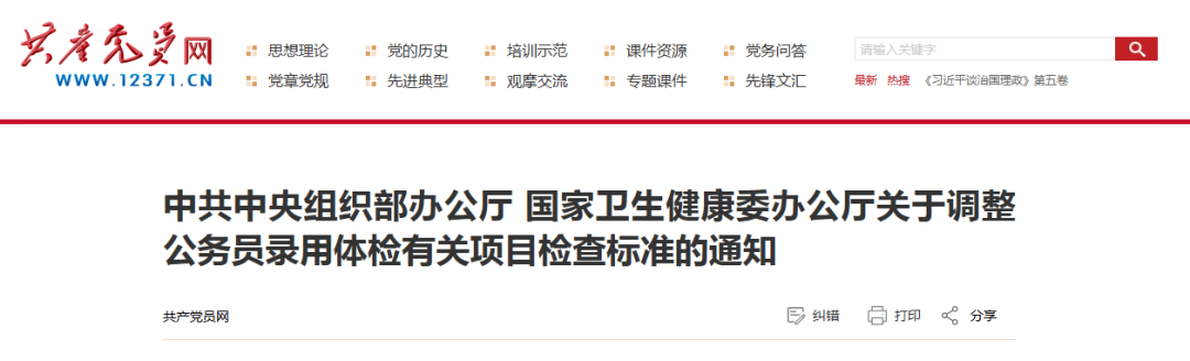 共产党员网11月14日发布《中共中央组织部办公厅国家卫生健康委办公厅关于调整公务员录用体检有关项目检查标准的通知》: