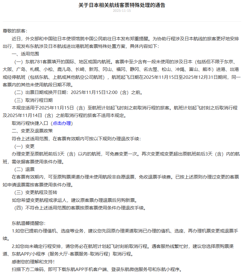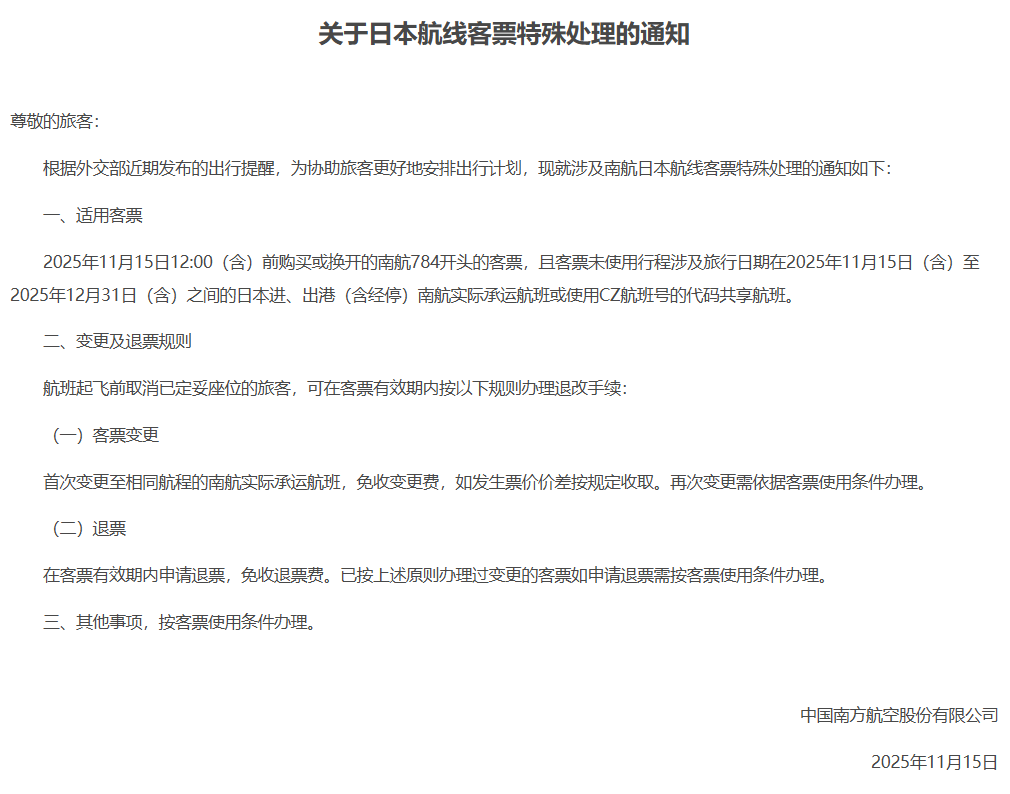 根据外交部近期发布的出行提醒,为协助旅客更好地安排出行计划,现就涉及南航日本航线客票特殊处理的通知如下: