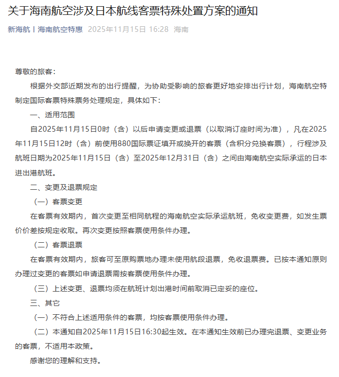 自2025年11月15日0时(含)以后申请变更或退票(以取消订座时间为准),凡在2025年11月15日12时(含)前使用880国际票证填开或换开的客票(含积分兑换客票),行程涉及航班日期为2025年11月15日(含)至2025年12月31日(含)之间由海南航空实际承运的日本进出港航班。
