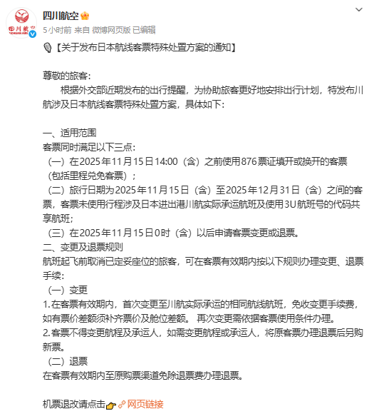 根据外交部近期发布的出行提醒,为协助旅客更好地安排出行计划,特发布川航涉及日本航线客票特殊处置方案,具体如下: