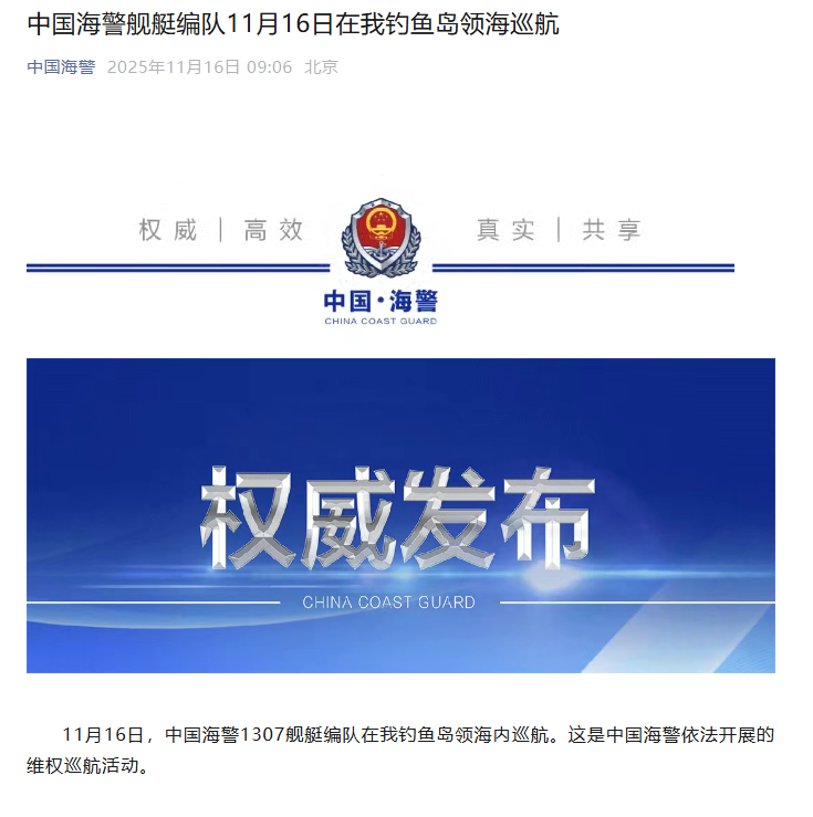 11月16日,中国海警1307舰艇编队在我钓鱼岛领海内巡航。这是中国海警依法开展的维权巡航活动。