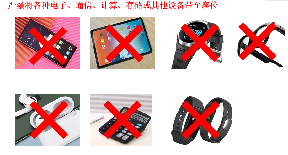 ●考生严禁将手机、智能手表、智能手环、智能眼镜、蓝牙耳机等通讯工具和电子设备带至座位。否则,无论是否使用均视为违纪;