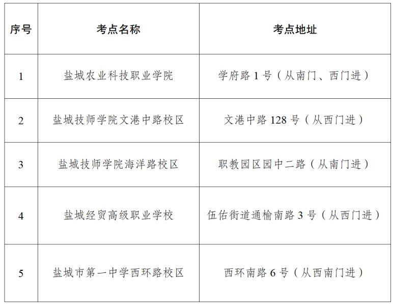 本次笔试共设5个考点,各考点区位、线路图及考场分布示意图等详情,请登录“盐城市人事考试服务平台-准考证打印”栏目页面下载查阅(http://jsychrss.yancheng.gov.cn/col/col23513/index.html)。