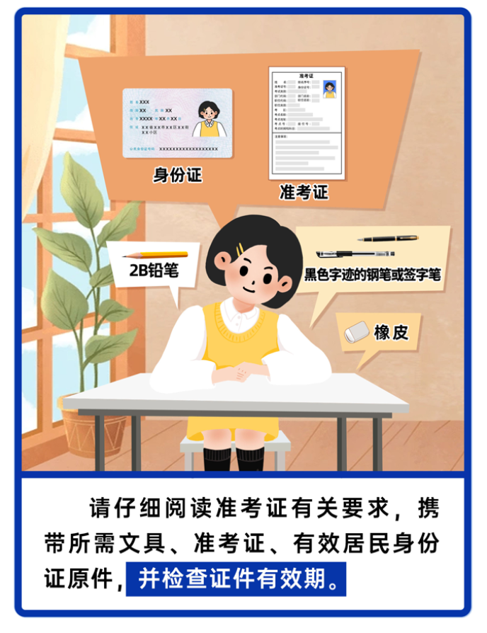 考生需按照准考证标注要求,携带好纸质准考证和有效身份证件原件方可入场考试。有效身份证件包括: