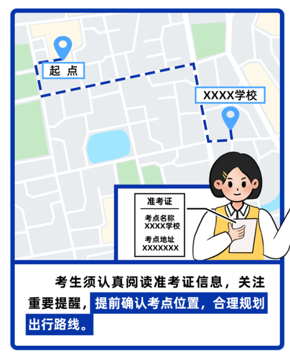 3.考点入口附近考试当天可能拥堵,有的步行至考场路程较长。考生应综合考虑天气、道路等状况,提前做好规划、预留足额时间到达,谨防迟到影响考试。