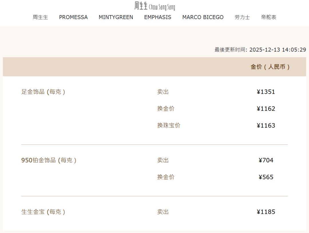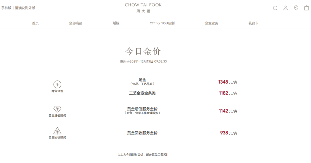 12月13日,现货黄金连续5日上涨,周大福、周生生、老庙黄金、老凤祥等国内部分品牌金饰克价也创年内新高。周大福金饰涨至1348元/克,周生生金饰涨至1351元/克,老凤祥涨至1345元/克。