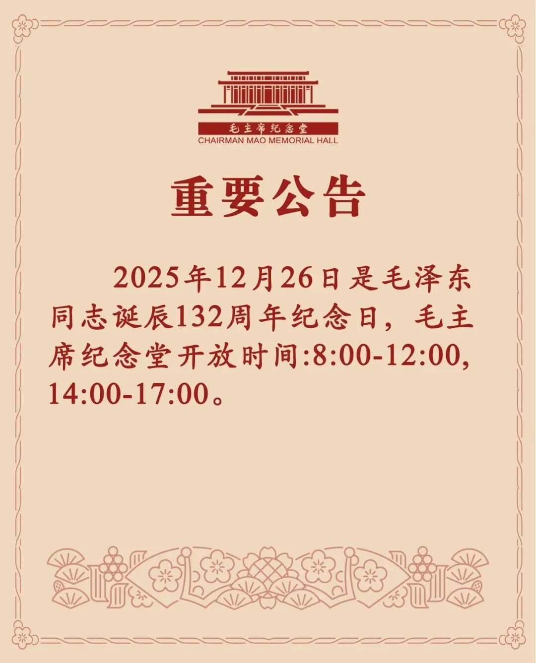2025年12月26日是毛泽东同志诞辰132周年纪念日,毛主席纪念堂开放时间:8:00-12:00,14:00-17:00。