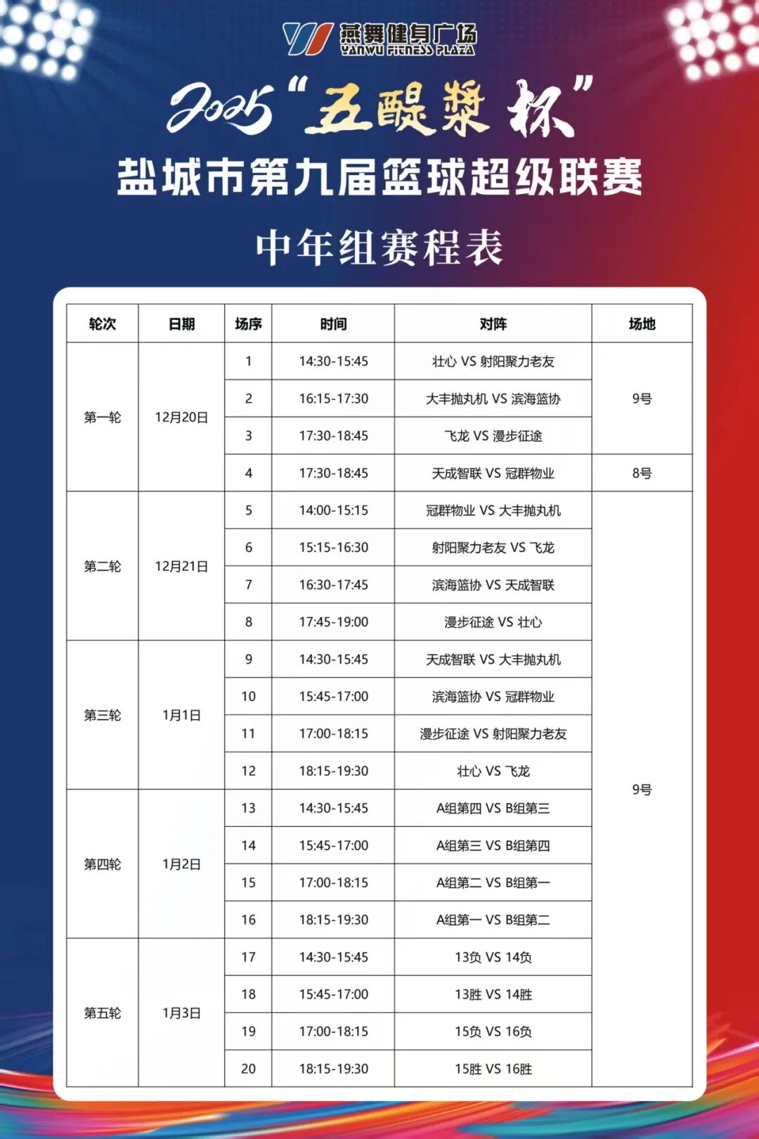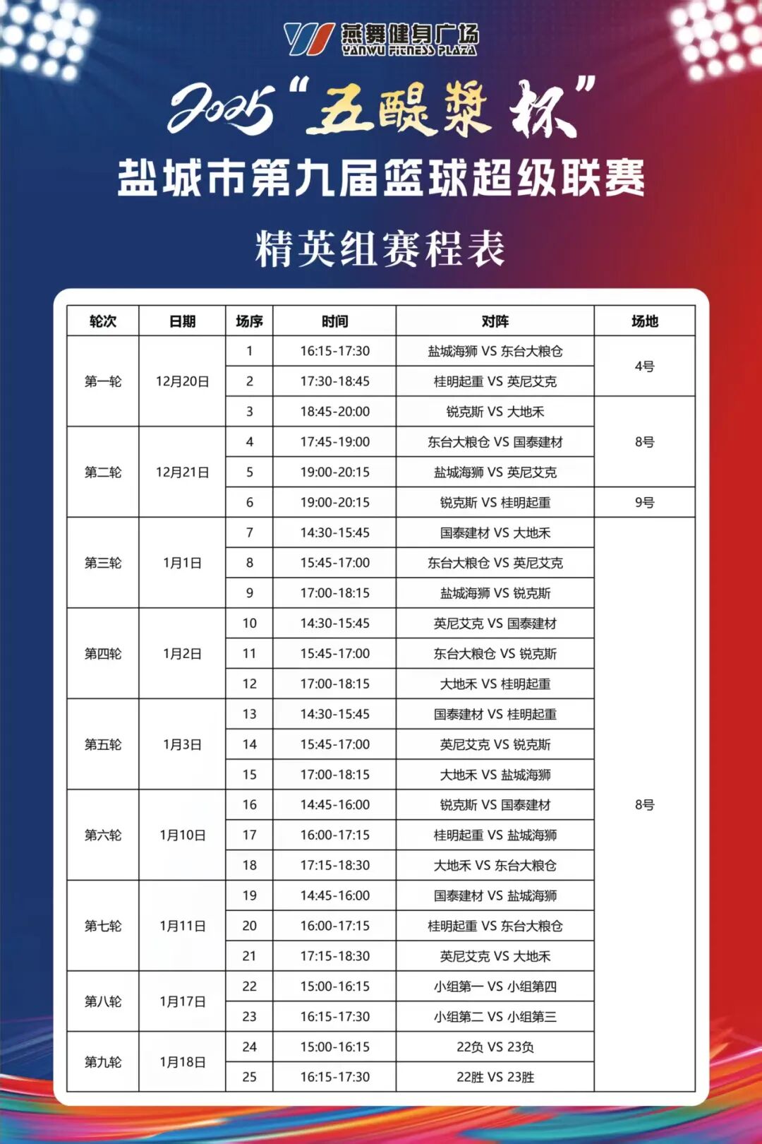 本次比赛共吸引了21支球队参与,其中包括国企组6支代表队,中年组8支代表队,精英组7支代表队。这些参赛队伍汇聚了盐城市篮球界的精英力量,他们来自不同的行业和领域,既有国有企业的职工队伍,展现着企业员工的蓬勃朝气与团队协作精神;也有来自民间的俱乐部球队,代表着盐城篮球爱好者的最高水平;更是有中老年运动员展示老当益壮,为热爱继续拼搏的精神。球员们个个摩拳擦掌,眼神中透露出对冠军的渴望和对篮球运动的热爱,他们将在接下来的比赛中全力以赴,为荣誉而战。