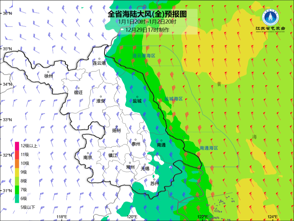 12月31日到1月1日白天我市将出现陆上6~7级、海区7级左右阵风,1月1日夜间到2日我市海区将出现8~9级阵风。