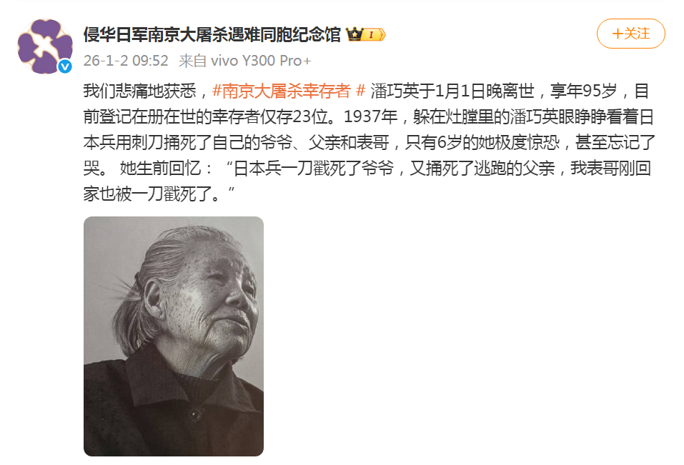 据侵华日军南京大屠杀遇难同胞纪念馆消息,南京大屠杀幸存者潘巧英于1月1日晚离世,享年95岁,目前登记在册在世的幸存者仅存23位。1937年,躲在灶膛里的潘巧英眼睁睁看着日本兵用刺刀捅死了自己的爷爷、父亲和表哥,只有6岁的她极度惊恐,甚至忘记了哭。 她生前回忆:“日本兵一刀戳死了爷爷,又捅死了逃跑的父亲,我表哥刚回家也被一刀戳死了。”