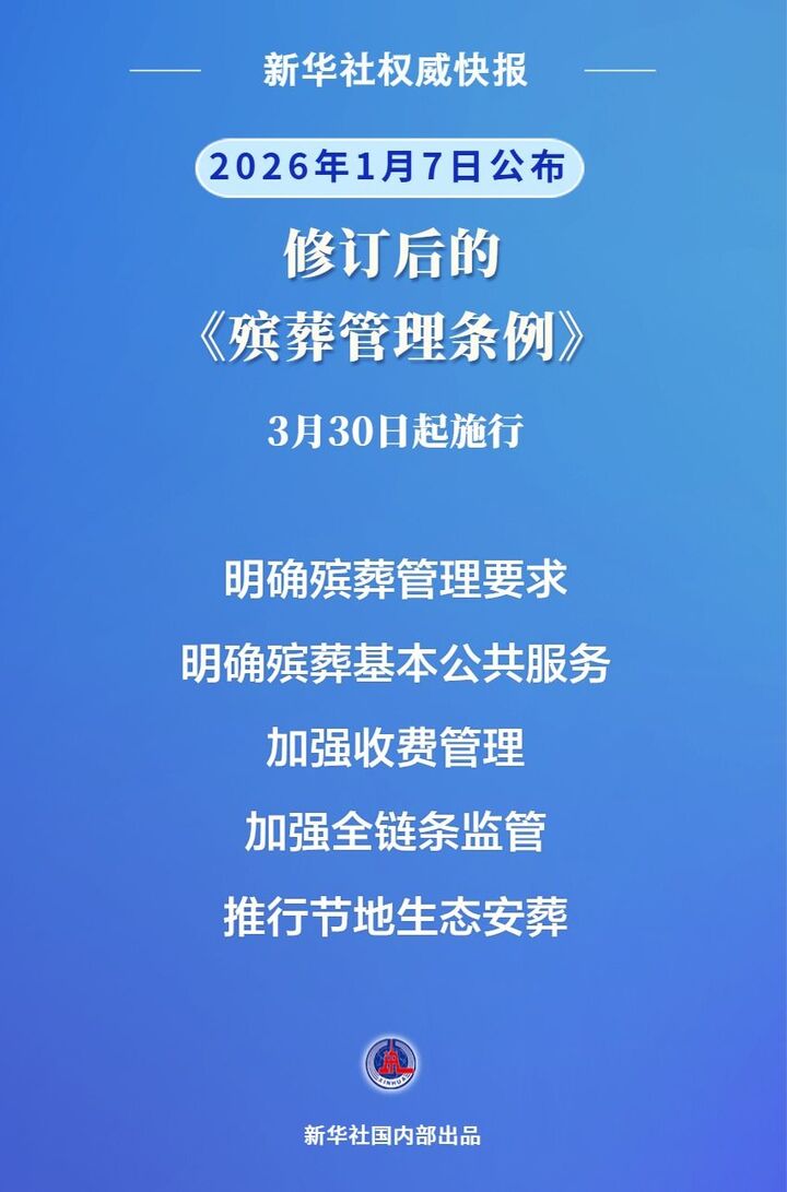 修订后的《殡葬管理条例》2026年1月7日公布,3月30日起施行。条例共8章73条,分为总则、殡葬设施、殡仪服务、安葬服务、丧事活动、监督管理、法律责任、附则。