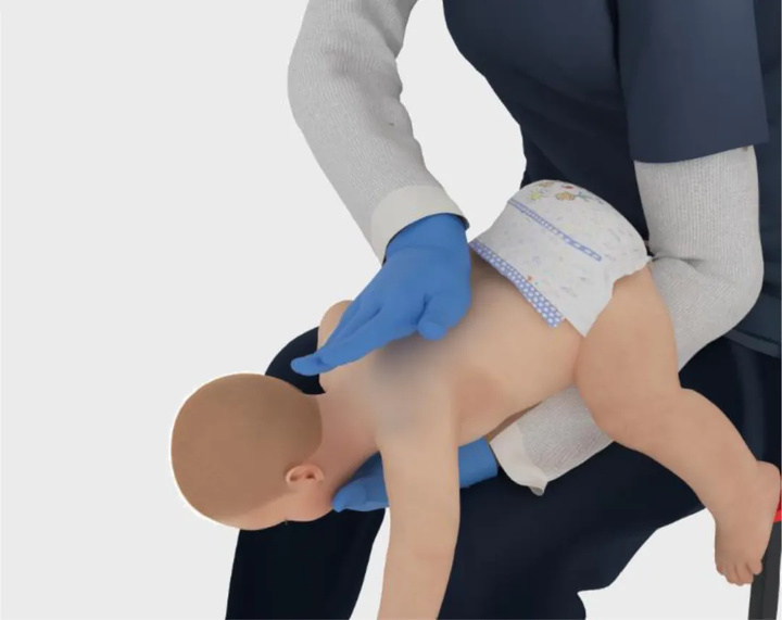 若异物仍未排出,此时将孩子夹住翻转,用掌根按压胸部5次,重复以上动作。