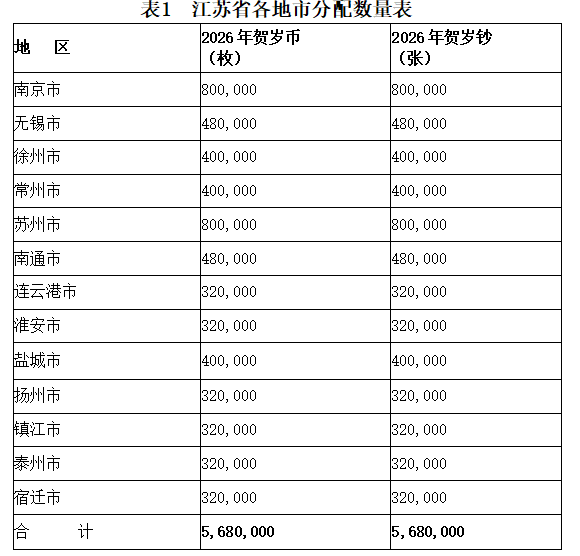 江苏省2026年贺岁币、2026年贺岁钞发行量分别为568万枚、568万张,江苏省内各地市分配数量见表1;南京市2026年贺岁币、2026年贺岁钞发行量分别为80万枚、80万张,南京市辖内各承办银行预约兑换网点及分配数量见表2。